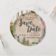 The two-sided Rustic Watercolor round card is the perfect Save the Date card for any outdoor themed wedding. This beautiful design is both romantic and rustic and works for rustic, forest or mountain destination events. The design features a round wood grain disc slice, wildflowers, and forest trees.