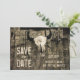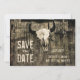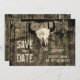 Rustic western wedding bull cow skull with horns vintage style save the date announcement flat card. Ranch grunge texture. Barn wood cowboy inspired. Antique sepia brown bison fine art. Image copyright Marg Seregelyi Photography.