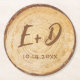For a rustic wedding theme. The background represents a brown wood slice. All text is brown hand letters. There are 2 big initials of the bride and groom, united with + sign. Under them, there is the date, in smaller digits.
