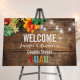 The design features a rustic wood base image, tropical flowers, and lights. Personalize by typing your wording over the sample text. You can also delete existing text, add other text, change the text color, and upload personal images.. To access advanced editing tools, please go to “Personalize”, and scroll down to access the “design tool” link. Please check the “Other products from this collection” link for matching products.