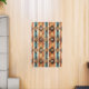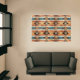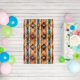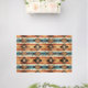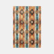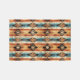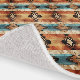 This attractive area rug has a western pattern in tones of blue, brown, cinnamon, tan, and cream. The geometric pattern is placed on a stripe background with a bit of grunge added in.