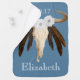 Rustic western floral with brown feathers cow skull with baby's name and birth date over a blue background.
