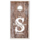 Challenge your friends to a rousing game of Cornhole with this Western flair set that features the look of a deep brown unworked wood customized with a large monogram letter and your family name. All are white, except the dark brown shadow that highlights your family name, which crosses your white monogram and the narrow band that frames each board. We've selected bright orange and yellow as the colors for the bean bags, but you can choose your own favorite colors when you personalize the set. In smaller print below "Family" are two lines of text: one is established date (your family or your current location) and below is city and state. Great for housewarming or anniversary gifts. Just click the "personalize" button to get started. Have fun and here's hoping you win!
