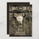 Rustic wedding western bull cow skull with horns vintage style save the date announcement flat card. Ranch grunge barn wood texture. Cowboy inspired design. Antique brown sepia bison fine art. Image copyright Marg Seregelyi Photography.