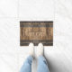 Rustic front doormat has the look of an aged whiskey barrel. Perfect for country homes & trailers! Customizable "Hey Y'All" greeting.