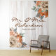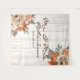 Rustic White Barn Wood Planks background, with gorgeous bouquet of flowers in burnt orange and cream florals with dusty green botanicals on the top right and lower left corners elegant script typography for personalized Mr. and Mrs. family name; combined with serif typography for customizable since date. It is a timeless design made specifically for a rustic wedding, or anniversary celebration.