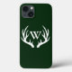 Rustic white deer antler silhouette with custom monogram letter in white. The background is hunter green be can be customized. This rugged case makes a great deer hunter gift.