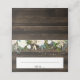 Rustic wedding folded place cards featuring greenery and white watercolor flowers with strings lights and a dark barn wood background. Designs are flat printed illustrations/graphics - NOT ACTUAL GOLD FOIL.