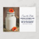 A save the date postcard with a rustic design. A white milk jug and a couple of orange flowers sitting in a barn on some hay. Wooden panels in the background.