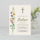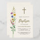 This rustic floral Baptism gold foil invitation features wildflowers and a cross on a soft cream background.