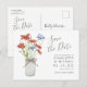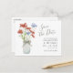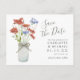 Rustic save the date postcard featuring a bouquet of watercolor wildflower such as poppies, cornflower and grass in a white ball jar.