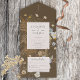 This design features delicate field and wild flowers and ferns on a brown background. A monogram completes the simple but elegant look of this all in one invitation. Personalized All-In-One invitations are a unique combination of both a beautifully printed custom invitation with an easy to tear off perforated RSVP postcard. And they are so easy to use! You simply fold, then seal the back flap with the three included clear stickers, and mail. And when your guests receive your custom invite, they just tear the perforated RSVP Card off and drop it back in the mail to you! This card is part of the Wildflowers on Brown Wedding Suite of cards created by Simply Farmhouse Press.
