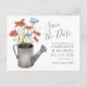 Rustic save the date postcard featuring a bouquet of watercolor wildflower such as poppies, cornflower and grass in a water can.