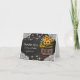 Stylish country thank you cards featuring a rustic black chalkboard backdrop, bridal lace corner decoration, string twinkle lights, summer golden yellow sunflowers, a winery wooden barrel wiith your initials and a piece of knotted string.