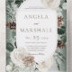 AVAILABLE WITH OR WITHOUT A QR CODE TO SCAN OR WITH DINNER OPTIONS. Introducing our enchanting winter wedding invitation, a perfect blend of elegance and natural beauty. Framed by lush winter pine greenery, delicate pine cones, white roses, and eucalyptus, this invitation captures the charm of the season in all its splendor. Against a soft white blur overlay with a serene green background, sparkling white lights create an atmosphere of magic and warmth. At the front flap, the bride and groom's first initials take center stage, adding a personal touch to the invitation. This design is a celebration of nature's grace, where the pine greenery and white roses symbolize everlasting love, and the eucalyptus reflects the harmony of your union. Prepare to captivate your guests with an invitation that exudes the beauty of winter's embrace. The gentle blend of greenery and sparkling lights creates an ambiance of enchantment and joy, making your wedding a truly unforgettable experience. Set the stage for a celebration that is as unique as your love story, and create cherished memories that will be cherished like the warmth of the season with this truly captivating invitation. Created by Simply Farmhouse Press.