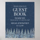 An elegant guest book sign for your rustic winter wedding with a snow covered country forest at night in navy blue and white.