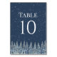 Rustic winter wedding table number cards with a snow covered country evergreen forest at night in navy blue and white. Customize these cards with your table numbers for a special addition to your wedding tables. Also suitable for birthdays and anniversary parties.