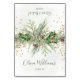 This elegant custom place card features a festive winter greenery design, perfect for adding a touch of natural beauty to your holiday or seasonal event. Adorned with lush fir branches, delicate pine needles, rustic pinecones, and vibrant red holly berries, the watercolor-style illustration creates a warm and inviting atmosphere. The design is complemented by sophisticated script typography for guest names and event details, all set against a soft, subtly textured background with hints of golden glitter.