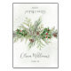 This elegant custom place card features a festive winter greenery design, perfect for adding a touch of natural beauty to your holiday or seasonal event. Adorned with lush fir branches, delicate pine needles, rustic pinecones, and vibrant red holly berries, the watercolor-style illustration creates a warm and inviting atmosphere. The design is complemented by sophisticated script typography for guest names and event details, all set against a soft, subtly textured background with hints of golden sparkle.