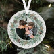 Elegant "Merry Christmas" round metal holiday photo ornament design features a rustic chic white wood grain background with a wreath of winter watercolor greenery framing the family picture. Personalize the modern and stylish green and charcoal gray wording with your choice of greeting, last name, and the year.