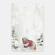A unique nature-inspired winter scene, this design has a watercolor snowy landscape with snow-covered fir trees and a grizzly bear wearing a red woolen sweater out in the cold. The pale background has abstract subtle shapes of trees and snow and adds to the rustic charm. This design can be personalized with your name, monogram or other text.