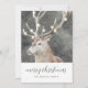 A serene winter stag in winter snow with glowing string lights on his antlers, and merry Christmas in a script font. A stylish modern rustic greeting card for the holidays.