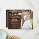Elegant chic winter wedding stylish thank you card template on brown barn wood featuring a small white flowers bouquet with foliage, strings or twinkle lights, and a chic faux gold calligraphy script. ++++++++++++++ Easy to personalize with your details and two photos on the front and back! +++++++++++ Suitable for elegant rustic country farmhouse or barn weddings.