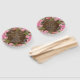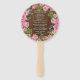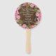 Rustic wood looking wedding program fan, with graphics of a pink peony floral wreath around the edge. Personalize the text, on both sides of the fan, for your wedding day.