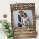 Send LOVE & THANKS with this rustic, country, brown weathered wood plank wedding photo thank you card with soft yellow glow string lights and title and wedding date in a country western hand-lettered font and your name in a rough brush script calligraphy. The back of the card features the same wood plank background and offers a place to type a general thank-you message (or delete the sample text to leave blank for personal handwritten notes of appreciation). ASSISTANCE: For help with design modification or personalization, resizing, transferring the design to another product or if you would like coordinating items, contact the designer BEFORE ORDERING via the Zazzle Chat MESSAGE tab below or email makeitaboutyoustore@gmail.com.