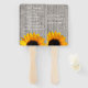 Rustic themed wedding program fan, with a washed out wood fence look and a big yellow sunflower peeking up from the bottom. Personalize the text for your wedding day.