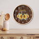 Rustic country farmhouse kitchen clock personalized with custom name. The dark wood background and watercolor sunflowers make this an unique home decor gift.
