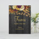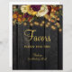 Fall floral botanicals and rusty orange pumpkin over a dark barn wood with string lights wedding or bridal shower favor sign.
