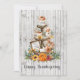 Rustic wood happy Thanksgiving watercolor Thanksgiving card with tiered tray loaded with pumpkins, coffee mugs spice sticks, pine needles, fall flowers, foliage and a quirky typeface. A cheerful Thanksgiving holiday theme for this year's day to give thanks.