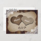 Rustic wedding RSVP postcard with meal selections featuring two burlap hearts on a burlap and wood background decorated with lace.