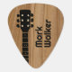 Cool and personalized rock design. Not real wood... just an image of wood grains at the background with a graphic black guitar. A great suggestion to self-promote the guitar-player of the band. Your name, or band-name, on front side & initials on back side. This is perfect to stand out and make an impression!