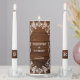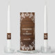 Rustic wedding unity candles personalized with bride and groom names and monogram initials.