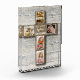 Modern First Holy Communion illustration featuring a wooden cross with pinned communion related images on a rustic background. Easily to change the 2 sample photos of the communicant with your own pictures to personalize the product.