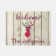 Are you a fan of rustic decor? If so, you will really like this deer head doormat. Displaying a white wood background, there is a ombre purple colored deer buck head illustrated on the center. Above the image is "Welcome" with your name written at the very bottom. Personalize today!