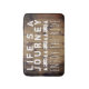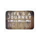 Rustic RV camping decor gift for rvers, adventure travelers, wanderers, retired couples, and campers- Personalized, distressed wood look bathmat reads 'Life's a Journey Enjoy the Ride', in handwritten and stamped look, white letters. With a cute, white border in between of vintage motorhome RV campers and pine trees. Against a brown background of rustic, distressed barn wood planks. Fun retirement gift for mom and dad. Would be right at home in an RV bathroom. We have coordinating 'Enjoy the Ride' rustic decor, as well as lots of camping theme decor in our Zazzle.com/angela65 shop.