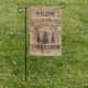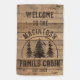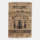 Personalized WELCOME garden flag for the family cabin. Rustic wood plank with forest trees design. Add an EST. date, the location or other text below or delete to leave blank. Contact the designer via Zazzle Chat or makeitaboutyoustore@gmail.com if you'd like this design modified or on another product.