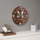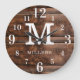 Monogrammed wall clock with a dark brown wood texture background. Personalize the family clock with your family name and monogram initial letter.