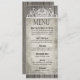 This striking tea length menu from my "Rustic Wood Filigree" collection features translucent white filigree over a rustic grey woodgrain background. The body of the menu is set against a panel of aged grey parchment. Use the "Customize It" button to add your own text on the back and front of the menu. Matching wedding invitations, save the date cards, favor stickers, thank you cards, RSVP response cards, postage stamps and more are also available. For questions, help or custom requests, email me: glamprettyweddings.com/contact. "Rustic Wood Filigree" original design by Cheryl Daniels © 2014.