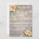 Save The Date Wedding Invitation Card Templates - Faux Gold Foil Script with Peach White Roses Floral and String Lights on Rustic Wood Background.