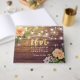 Wedding Guestbook Templates - Elegant Gold Script with Peach White Roses Floral and String Lights on Rustic Wood Background.