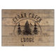 Personalized cutting board featuring a rustic brown wood plank and scenic forest trees design with your custom text. Ideal for a family cabin, lake house, rustic lodge or nature retreat and vacation home rental property. ASSISTANCE: For help with design modification or personalization, color change, resizing, transferring the design to another product or if you would like coordinating items, contact the designer BEFORE ORDERING via the Zazzle Chat MESSAGE tab or email makeitaboutyoustore@gmail.com.