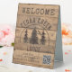 Welcome guests to your cabin or rental property and offer connection to your website or Wi-Fi via a QR Code with this personalized free-standing tabletop sign featuring a rustic wood plank and scenic wilderness forest trees design. Ideal for resort and vacation rental properties or family cabins, lake houses, rustic mountain lodges and nature retreats. The sample is shown in the 6x8" size; other sizes are available on the ordering page. ASSISTANCE: For help with design modification or personalization, color change, resizing, transferring the design to another product or if you would like coordinating items, contact the designer BEFORE ORDERING via the Zazzle Chat MESSAGE tab below or email makeitaboutyoustore@gmail.com.