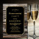 A rustic gold bordered wood housewarming party invitation with gold text on a black background.