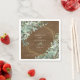 Perfect for nature themed weddings, these rustic watercolor botanical paper napkins feature bouquets of eucalyptus greenery decorating the gold geometric frame around the names of the bride and groom and the wedding date, with a rustic brown wood background.