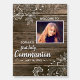 Modern First Holy Communion illustration featuring a rustic wooden background with decorative lace flowers and leaves, modern typography calligraphy script. Easily to change the sample image of the communicant with your own picture to personalize the product.