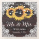 Custom rustic sunflower wedding coasters featuring sunflowers on a barn wood background adorned with white floral lace and string lights. Matching items available to complement these rustic chic sunflower wedding glass coasters.